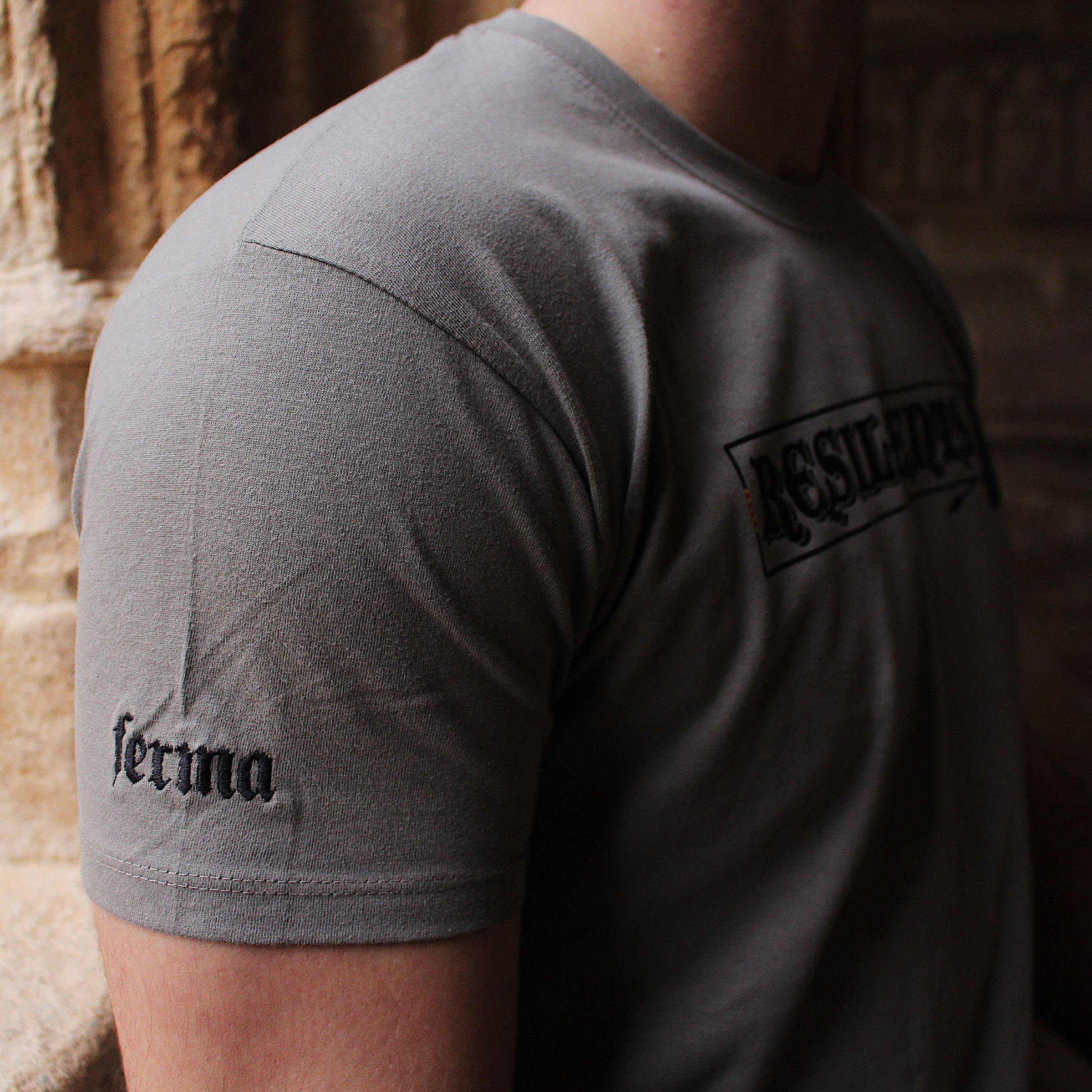 Samarreta gris, amb estampació al pit de la cimera reial de Jaume I amb la inscripció “Resilients”, i brodat identificatiu de Ferma a la màniga.